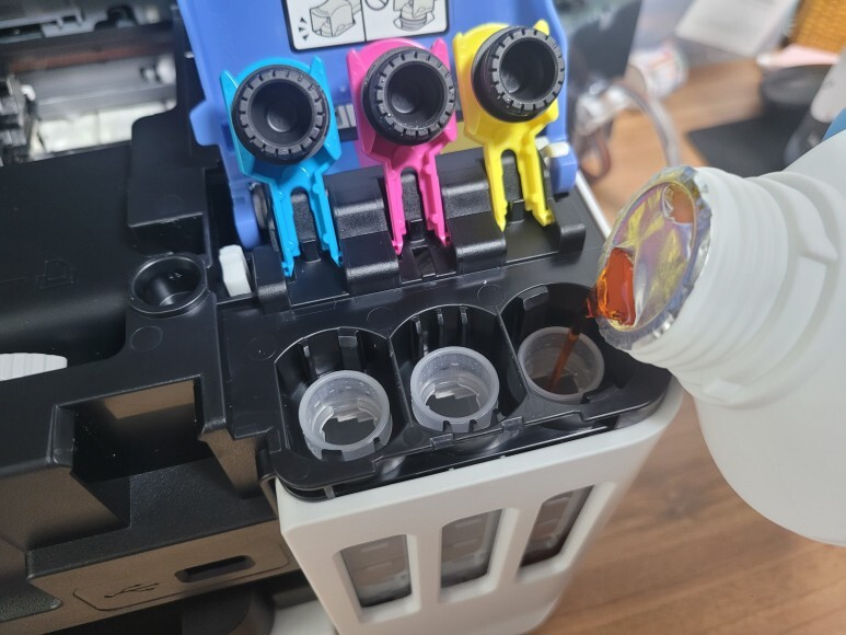 잉크를 대자로 콸콸콸 부었습니다. 넘치지 않게 적당히 90%만 부어서 채웠습니다. 잉크를 붓다가 오염되는 게 거의 대부분입니다. 그리고 외부에 콸콸콸 부어서 사용할 잉크통을 잉크퀵차단밸브 장착, 결합했습니다.