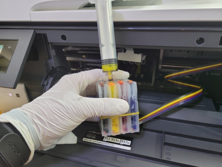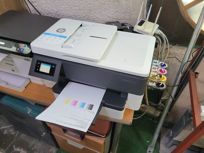 경기도 광주시 고산동 소재, 사무실에서 사용하는 HP 7720 무한잉크로 업그레이드 및 잦은 카트리지 문제 및 소모품 시스템 문제로 멈춰버린 유한 4칩 HP 7720 무한잉크 장비를 기업형, B2B용 (보험사, 군부대, 학교, 학원, 부동산, 핸드폰매장, 교육사 등등)으로 사용되는 칩없이 구동하는 기업형 No Chip 무한잉크 장비로 전환 출장수리 요청으로 스케줄 맞춰 방문하여 수리 완료 했습니다.