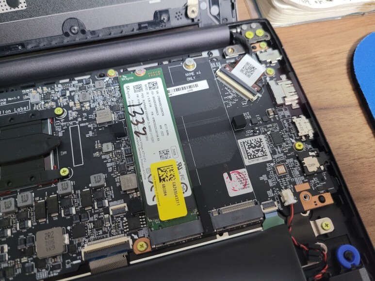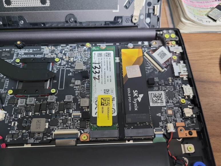 기본 장착 256MB SSD가 장착되어 있고 옆에 추가 장착 가능한 PCIe 슬롯이 있습니다.