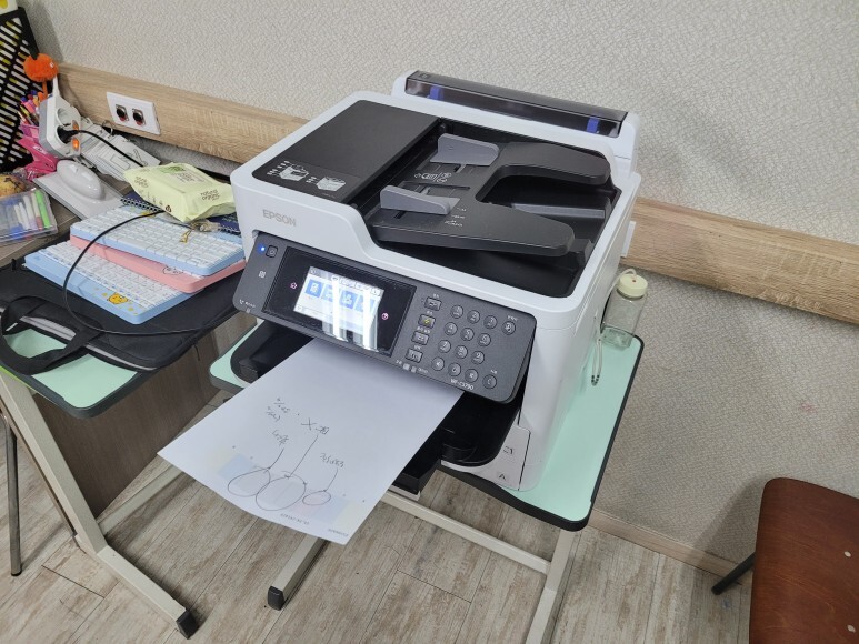 영어학원에서 사용하는 칩없이 구동되는 무한잉크 장치인 엡손 WF-C5790 무한 프리필 장착 팩스복합기 장비인데 화면세 프린터 오류 034841 문제로 출장수리 요청하여 스케줄 잡아 이동, 출장수리 완료했습니다.