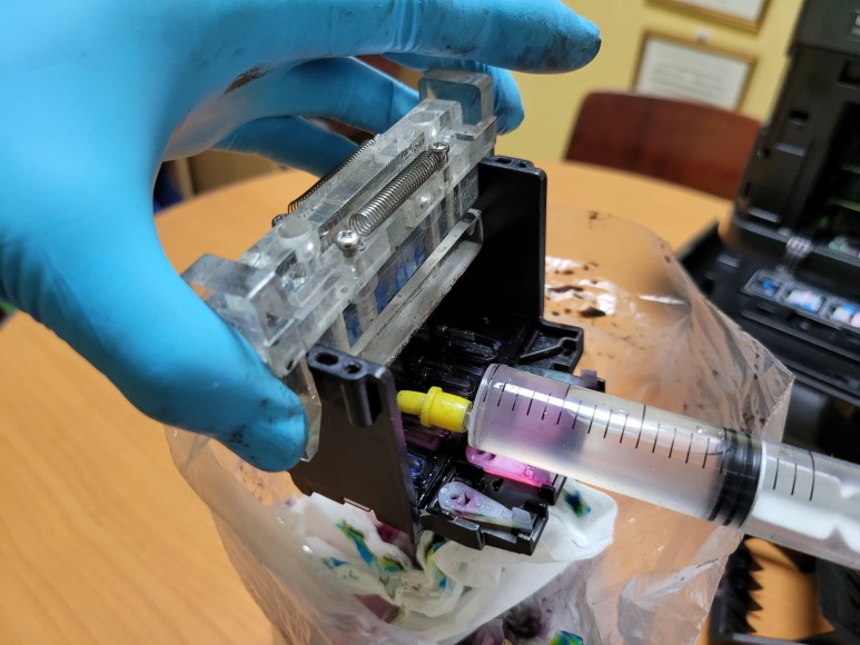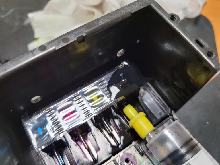 헤드 수리를 위해 세정액 약 200ml, 헤드 석션팁이 장착된 주사기, 8T 별드라이버, 헤라(플라스틱 카드), 핀켓, 탄성접착제, 헤드 챔버 보호 압착 지그, 반투명테이프...를 준비했습니다. 그리고 헤드를 프린터에서 꺼내 분해했습니다. 헤드 내부가 심하게 오염되어 있고 잉크가 흐른 자국이 보입니다.