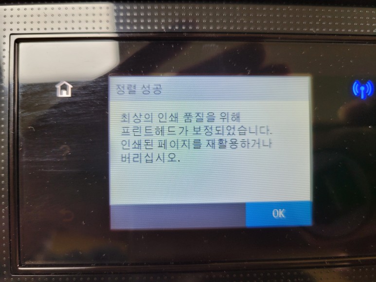 정상적으로 헤드 정렬 페이지가 출력되었습니다. 헤드 세척 후에 헤드 노즐 상태를 점검하기 위해 인쇄 품질 진단 페이지를 출력했습니다.