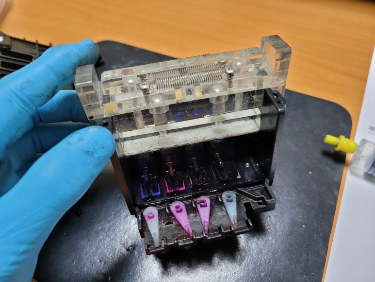 막상 헤드를 분해해 보니 마젠타 색상의 노즐이 막혀 세정하려고 했지만 블랙색상의 챔버가 터져 있었습니다.