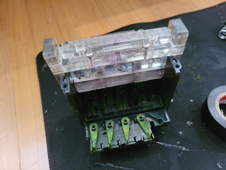 공급기(잉크통)에는 잉크가 있지만 카트리지 내부에 잉크가 모두 소진되어 나타난 잉크 카트리지 소모됨 (Ink Cartridges depleted) 이지만 원인은 헤드 챔버가 터지고 오염으로 칩판부 비닐이 떨어져 잉크를 카트리지 쪽으로 가져 오지 못하면서 발생된 상태였습니다.