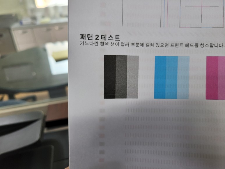 인쇄 품진 점검 페이지를 출력하여 노즐 상태를 점검하였습니다.