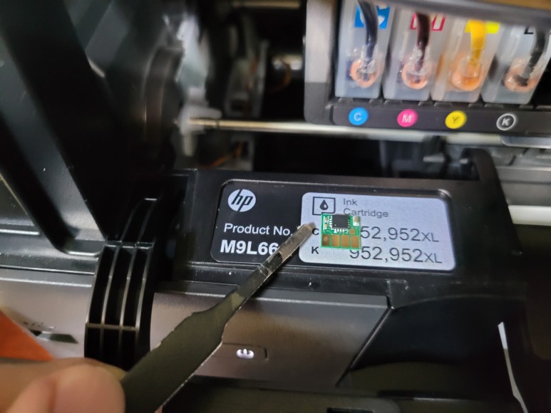 위와 같은 메세지는 HP 8710 무한잉크를 온라인으로 구매하신 분들에서 많이 나타납니다. 카트리지를 빼보면 중국산 4칩으로 되어 있습니다. 온라인 판매제품은 낮은 가격으로 노출하기 위해 저렴한 시스템을 사용한 경우 자주 나타납니다. 카트리지 소모됨으로 초기화 작업을 하면 사용량이 별로 없어도 잦은 펌핑으로 스테이션에 잉크가 넘쳐 흐르기도 합니다. 자동 펌업데이트로 칩을 새로 교체해야 하는 경우도 자주 발생합니다.