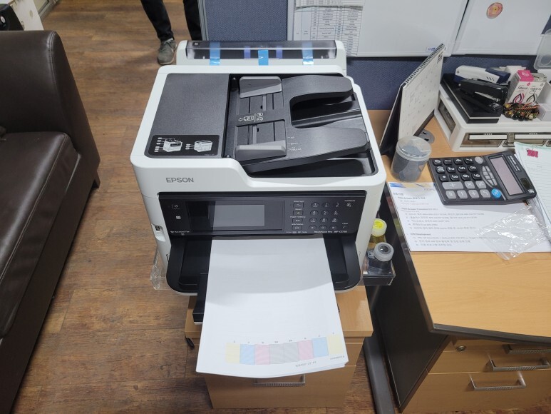 유제품 유통관련 업체 사무실에서 문서 출력용으로 사용하는 A4 칩없이 구동하는 기업형 엡손 WF-C5710 팩스복합기 무한잉크 월 1,000장 출력 기준, 3년 약정 (자동연장), CMS 계좌 자동결재계약 임대설치 완료 했습니다.