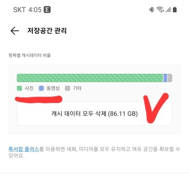 카카오톡 <앱관리> 페이지에서 <저장공간관리> 페이지로 이동하니 사진으로 가득 차 있는 캐시 데이터로 86.11GB 어마어마 하게 사용되고 있었습니다.