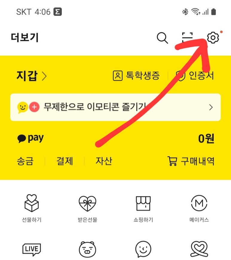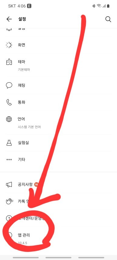 사진과 같이 카카오톡의 상단 오른쪽의 톱니바퀴 ⚙️ <설정>으로 이동하여 설정페이지 맨 하단에 <앱관리>로 이동합니다.