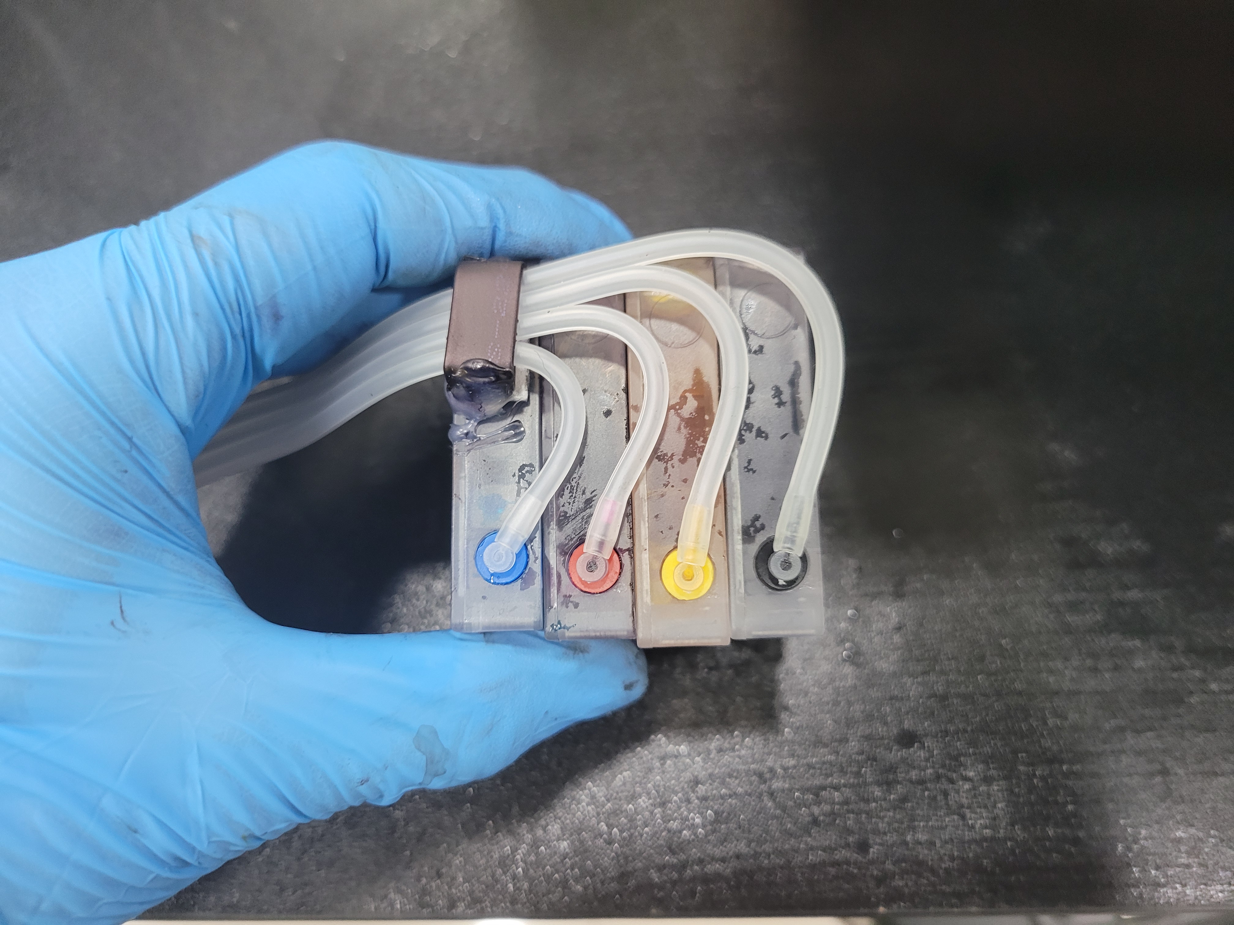 출력불량 및 잉크 카트리지 문제로 빠른 전체 점검 필요 이유 : 1. 호스 내 잉크 경화로 잉크공급 不 2. 카트리지 부싱 및 패킹 노후로 공기유입으로 잉크공급 不 3. 헤드 內 잉크공간 챔버 터짐 (칩판부 슈팅에어라인 비닐탈락, PCB 오염) 4. 스테이션 펌핑모터 불량으로 인한 잉크공급 不