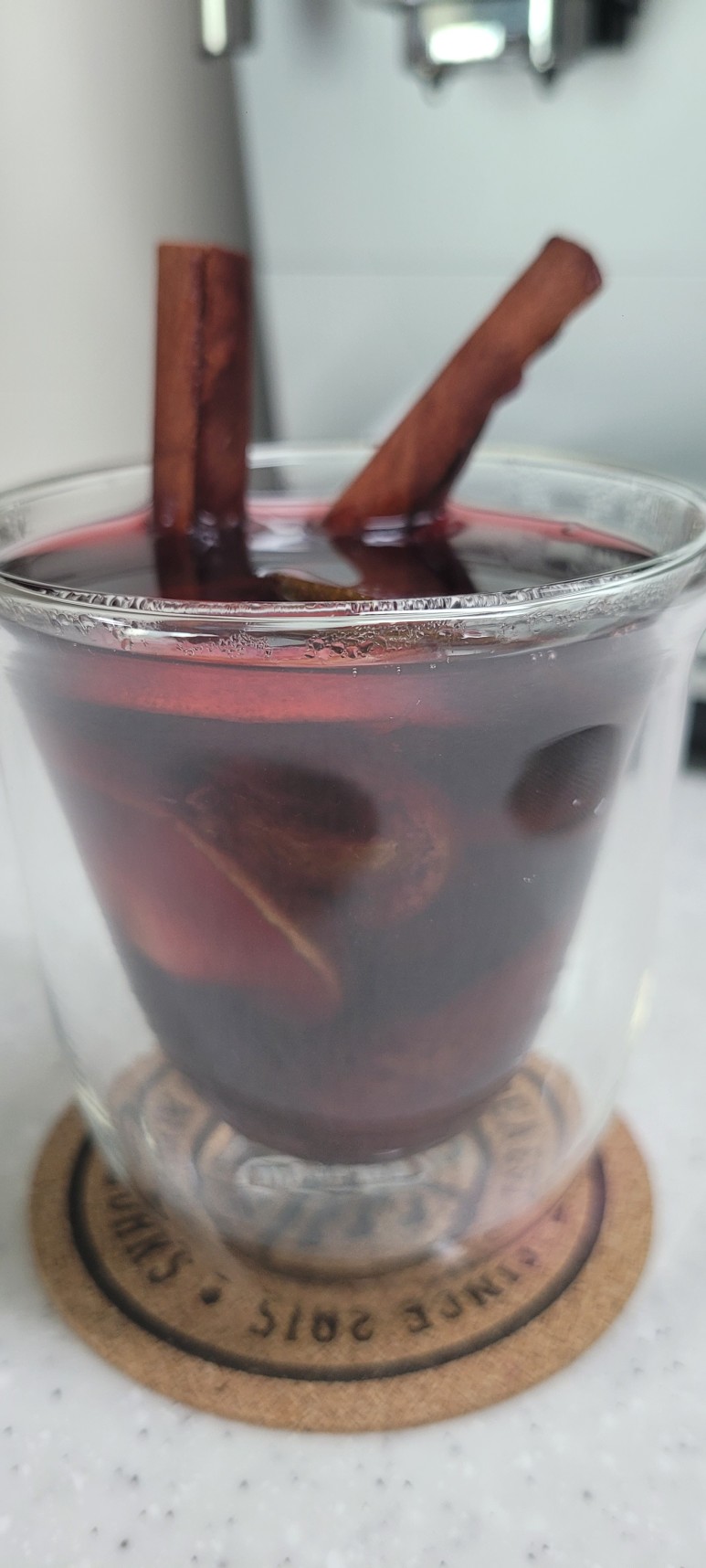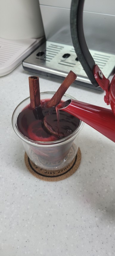 펄펄 끓인 뜨거운 와인과 빛깔을 보기 위해 일반 머그컵 및 스텐레스 잔이 아닌 내열 이중 글라스, 유리컵을 준비해 뜨거운 와인을 부었습니다.
