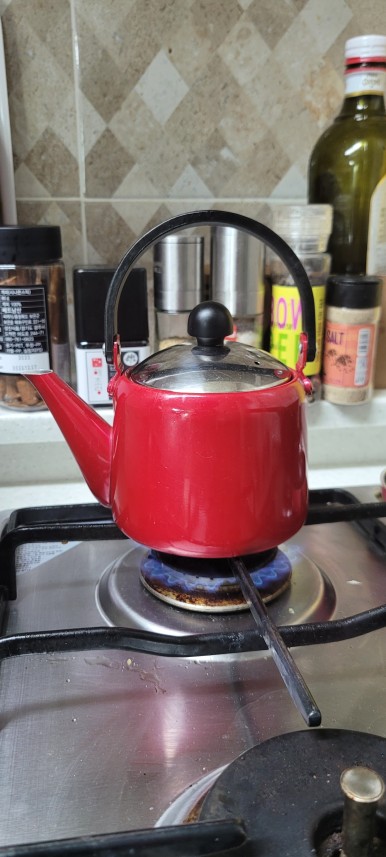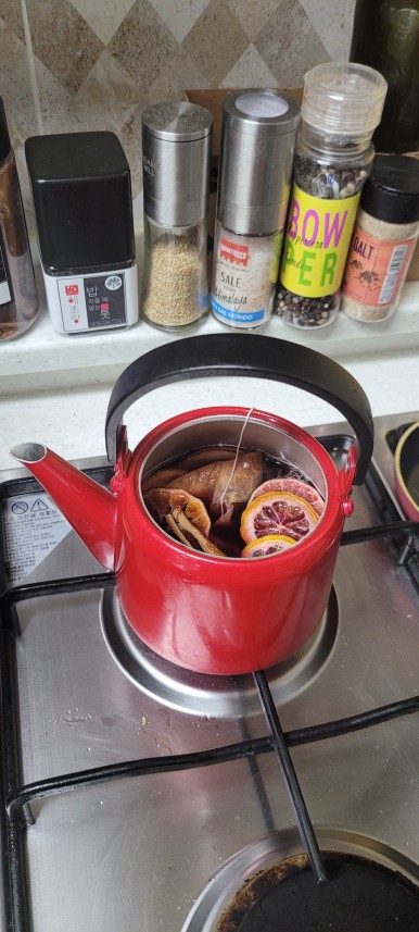 추가 향신료로 정향 티백과 계피(스나몬 스틱)를 넣고 가장 작은 화구의 스토브 위에 올렸습니다.