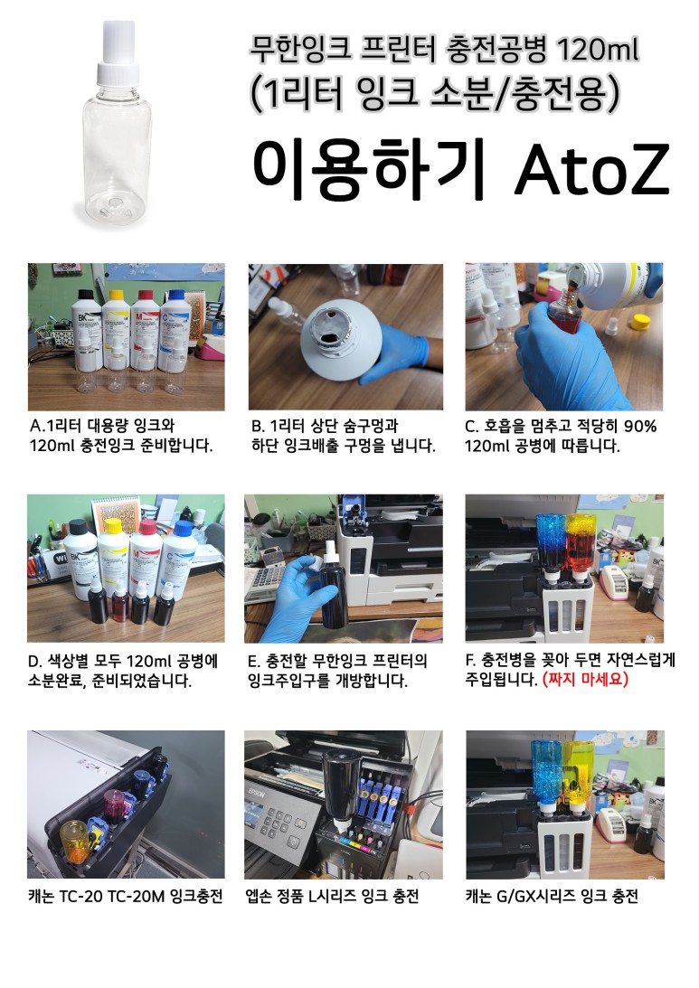 정품잉크보다 50ml 더 많은 120ml 충전공병의 잉크가 모두 들어갑니다. 초기화 후에 다시 120ml 충전공병에 잉크를 소분한 후에 다시 잉크공급장치에 잉크보충하면 50ml 이상이 더 들어갑니다. 총 170ml이상의 잉크가 초기화에 보충됩니다. 기본 제공되는 정품 번들잉크 70ml 보다 사실 100ml 더 충전됩니다. 정품잉크를 사용한다면 사실 색당 70ml 2~3개가 필요한 셈입니다.