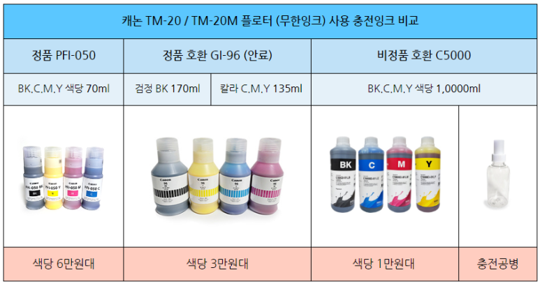 - 캐논 TC-20/TC-20M 플로터에 사용되는 PFI-050 와 GI-96 잉크는 캐논 정식 정품 잉크입니다. 정품잉크를 사용시에는 용량도 2배가량 크고 가격도 50% 가량 저렴한 GI-96 잉크 사용이 합리적입니다.