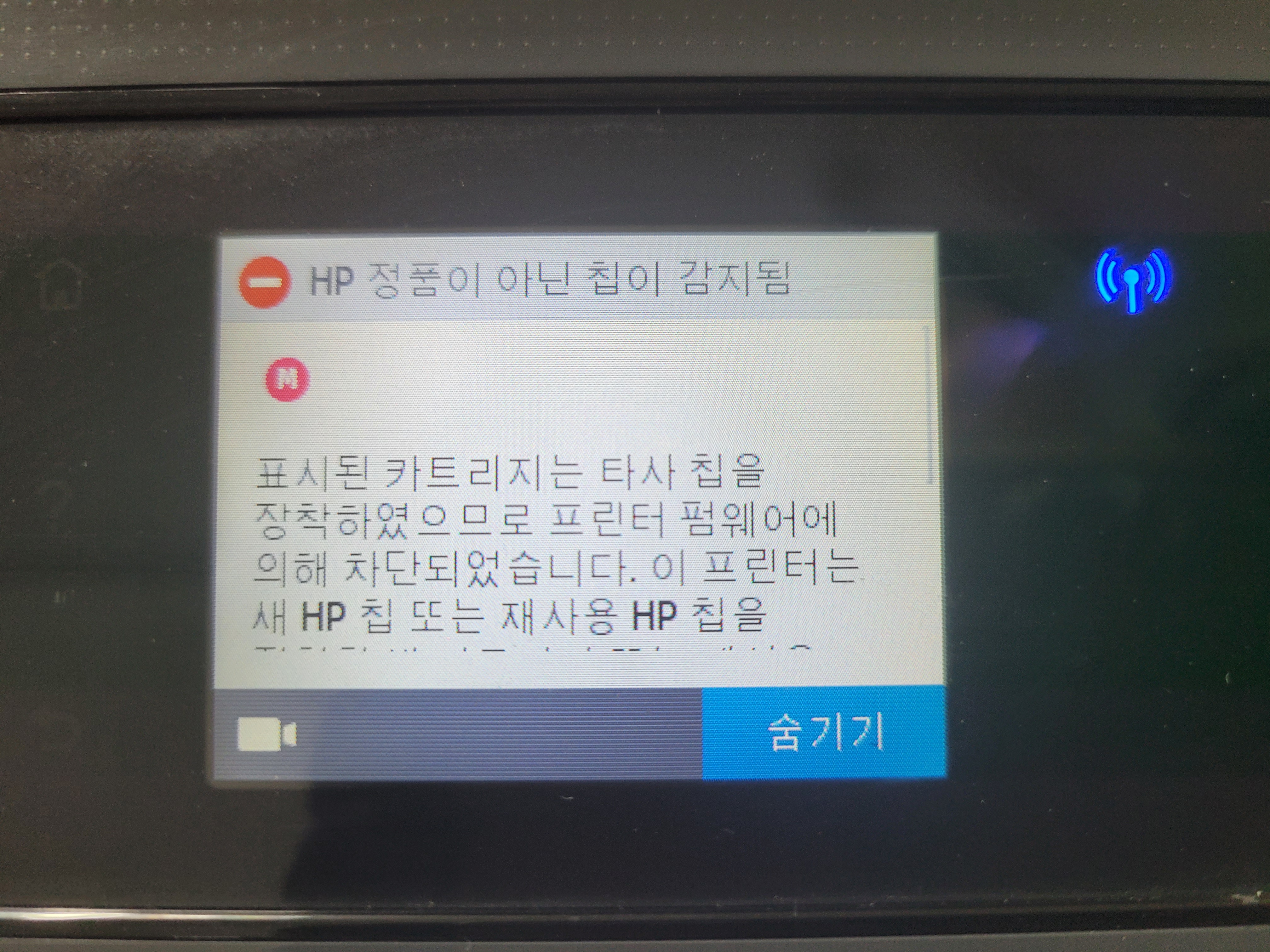 건축 건설관련 사무실에서 도면 및 문서용으로 사용하는 HP OfficeJet Pro 7740 팩스복합기 A4 A3 무한잉크프린터인데 HP 정품이 아닌 칩이 감지됨 표시된 카트리지는 타사 칩을 장착하였으므로 프린터 펌웨어에 의해 차단되었습니다. 문제로 출장수리 요청하여 스케줄 잡아 이동, No Chip 처리 및 인증칩 처리된 메인보드 교체 수리하였습니다.