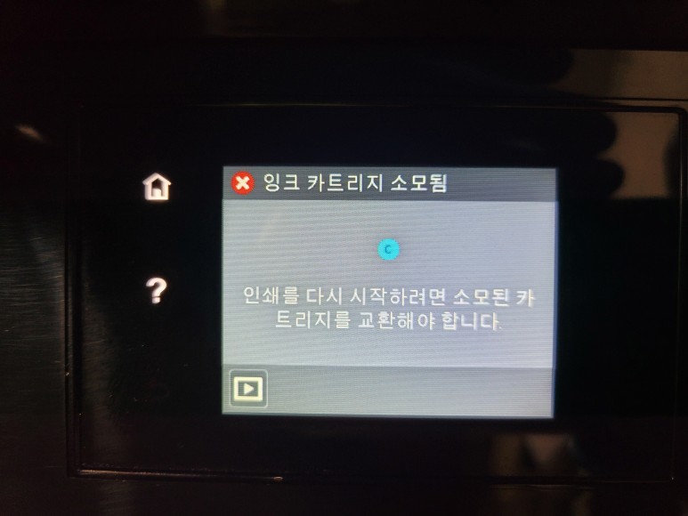 잉크 카트리지 소모됨, 시안(C) 파랑색이 먼저 소모됨 에러가 나타났습니다. 4색 모두 카트리지 내부에 잉크가 빠져 있었습니다.