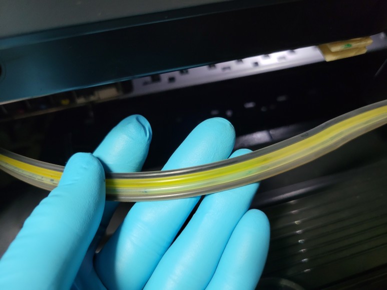 정압식 공급기로 에어홀 공간에는 잉크가 차 있으면 안 되어 눕혀 잉크를 큰 잉크공간으로 모두 넘겼습니다. 호스에 4색 모두 잉크가 빠져 전혀 잉크 공급이 안 되고 있었습니다.