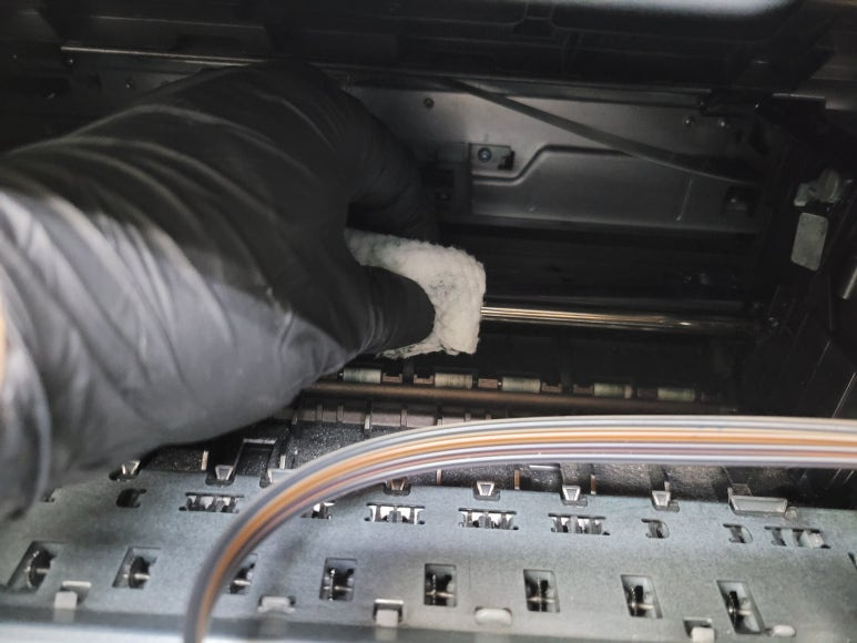 출력불량 및 잉크 카트리지 문제로 빠른 전체 점검 필요 이유 : 1. 호스 내 잉크 경화로 잉크공급 不 2. 카트리지 부싱 및 패킹 노후로 공기유입으로 잉크공급 不 3. 헤드 內 잉크공간 챔버 터짐 (칩판부 슈팅에어라인 비닐탈락, PCB 오염) 4. 스테이션 펌핑모터 불량으로 인한 잉크공급 不