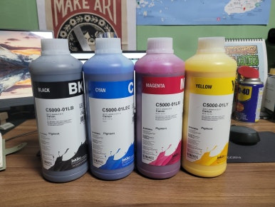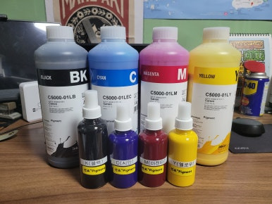 캐논 MAXIFY GX 시리즈 호환잉크 검정 안료(Pigment) 칼라 염료(Dye)는 노랑색은 맑고 투명하여 쉽게 구분이 가는데 나머지는 소분하여 충전병에 완충시에 서로 구분이 힘들어 라벨링이 되어야 합니다.