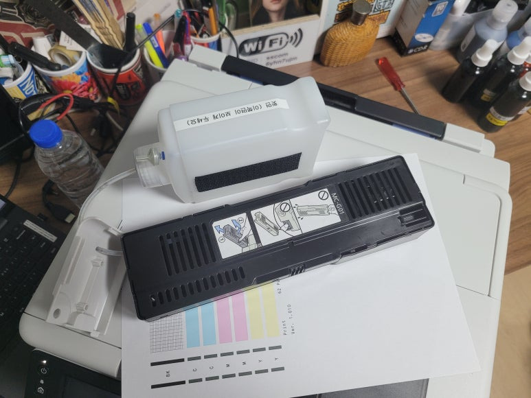 벨크로를 이용해 장비 옆면에 깔끔하게 붙였습니다. 폐잉크가 쌓이면 언제든지 뚜껑을 열어 비우고 재장착 사용할 수 있게 하였습니다. 폐잉크는 절대 유지보수카트리지(MC-G01) 및 프린터 내부에 남지 않고 밖으로 배출되어 모이면 다시 비우면서 최대한 장비를 청결하게 유지할 수 있게 했습니다.