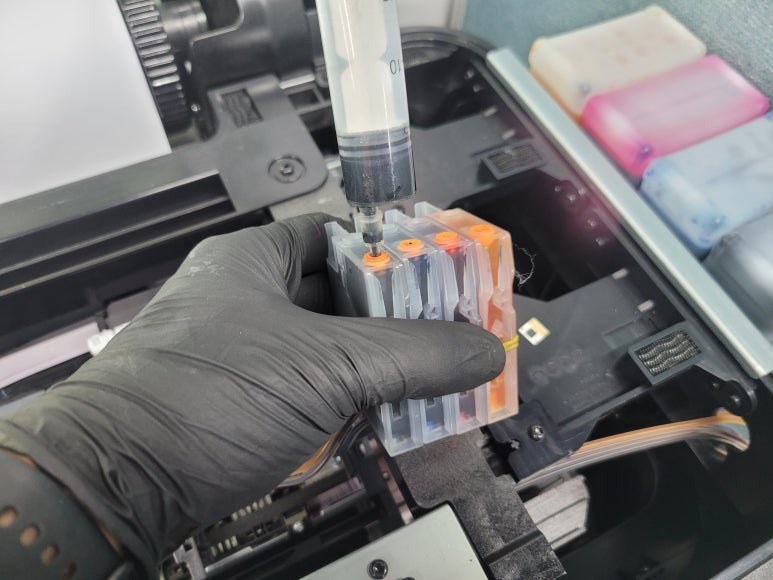 ● 카트리지 호스 라인 잉크 경화로 막힘, 세정액 주입 세척