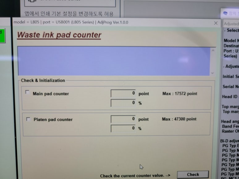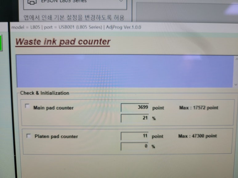 서울시 강북구 미아동 소재, 엡손 무한잉크 L805 6색 프린터에 전사잉크 세팅된 프린터로 프린터 잉크 패드의 서비스 수명이 다 되었습니다. 오류 메세지로 출력불가, 출장수리 요청하여 스케줄 잡아 이동, 출장수리 완료했습니다.