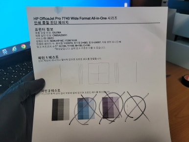 HP OfficeJet Pro 7740 팩스복합기 인쇄 품질 진단 페이지 확인, 정상적으로 출력되어 나왔습니다.