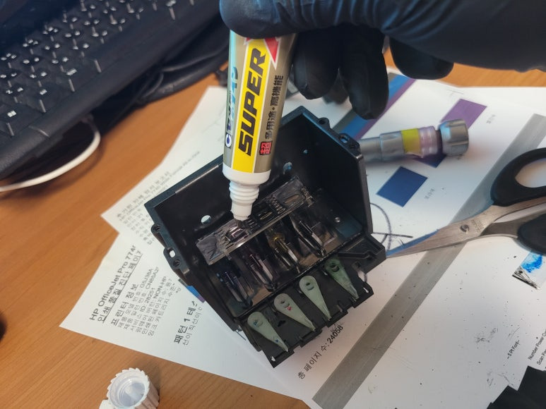 HP OfficeJet Pro 7740 팩스복합기 프린터 헤드 챔버가 블랙 및 시안 색상이 터져 있습니다. (뇌출혈 상태) 탄성접착제 도포 및 테이핑 수리 했습니다.