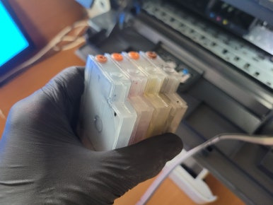 잉크 경화된 세정액을 주입하여 세척하고 카트리지 잉크 석션하여 호스 및 카트리지 내부에 잉크를 가득 채웠습니다.