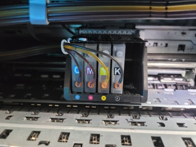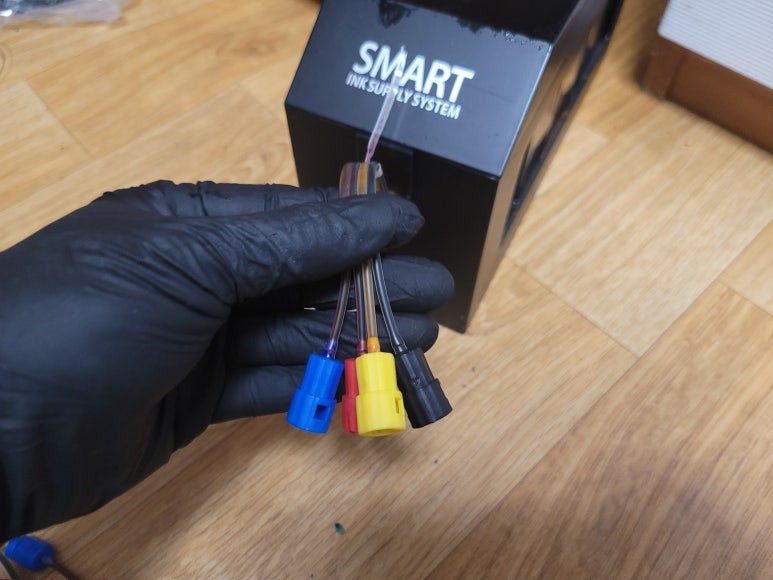 잉크공급라인, 호스 내부에 잉크가 너무 단단히 경화되어 막혀 있습니다. 카트리지는 칩이 제거된 상태지만 정상적이지 않습니다.