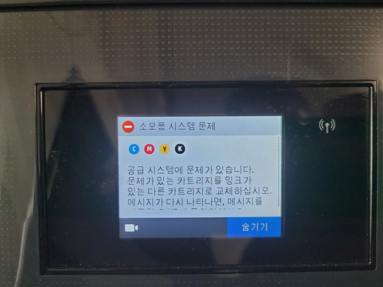 공급시스템에 문제가 있습니다. 문제가 있는 카트리지를 잉크가 있는 다른 카트리지 교체하십시오.