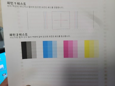 인쇄 품질 진단페이지 출력하여 프린터 헤드 노즐 상태 확인, 혼색되어 색상이 안 나오고 매우 불량했습니다.