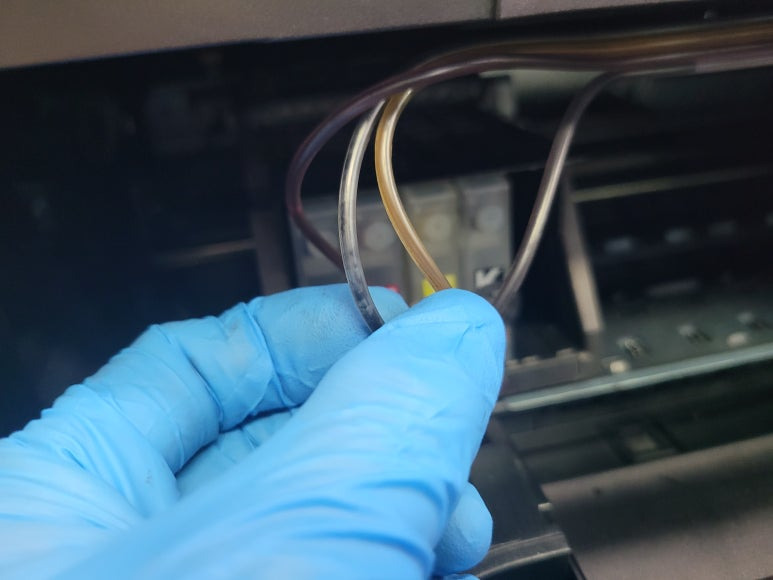 잉크 공급 불량으로 인해 잉크공급라인, 호스 내부에 잉크가 경화되어 막혔습니다.