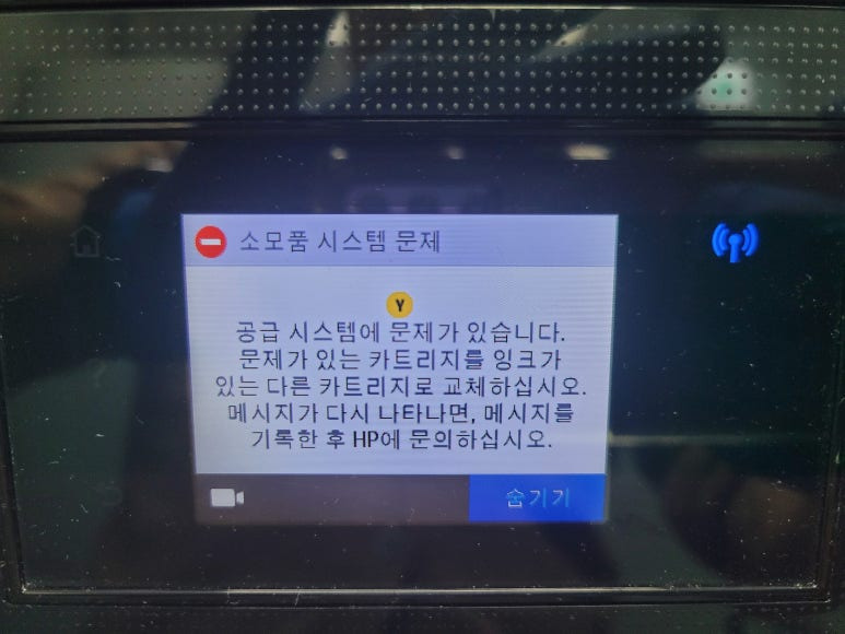 HP OfficeJet Pro 8710 팩스복합기 무한잉크 장치는 소모품 시스템 문제 및 공급 시스템 문제는 전면 커버를 열었다 닫았다 3회 진행하면 카트리지 확인 후 정상 작동됩니다.