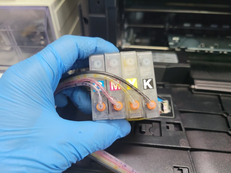 카트리지 잉크 석션 해서 주유소 ⛽ (잉크통)에 있는 잉크를 자동차 🚗 기름통 🛢 (카트리지)에 주유해서 채워야 합니다. 추가로 시동걸어서(작동) 후 헤드(엔진 ) 불량 확인 시에 추가 수리 🛠 비용듭니다.