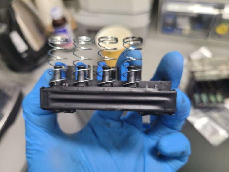 HP 952 프린트 헤드를 분해하니 BK 챔버가 터져 잉크가 새고 오염되어 있습니다.