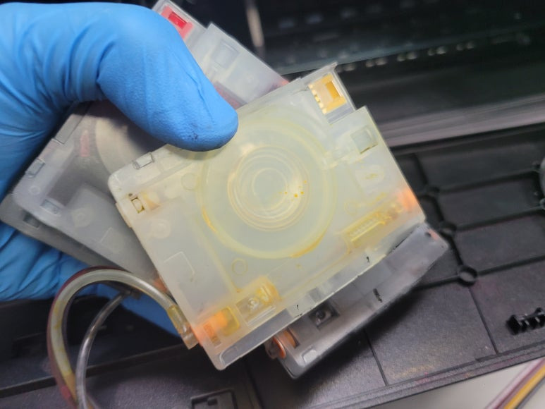HP officeJet Pro 8710 팩스복합기 무한잉크 카트리지에 잉크가 심하게 오염되어 있습니다.