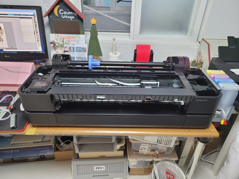 인천시 서구 소재, POP 및 홍보물 포스터 등등 출력용으로 HP 다자인젯 T230 24인치 플로터에 칩없이 구동하는 無칩 No Chip 카트리지 및 색당 500ml 잉크통 장착 총 2,000ml 무한잉크 장착 설치 완료했습니다.