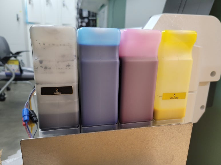 출력불량 및 잉크 카트리지 문제로 빠른 전체 점검 필요 이유 : 1. 호스 내 잉크 경화로 잉크공급 不 2. 카트리지 부싱 및 패킹 노후로 공기유입으로 잉크공급 不 3. 헤드 內 잉크공간 챔버 터짐 (칩판부 슈팅에어라인 비닐탈락, PCB 오염) 4. 스테이션 펌핑모터 불량으로 인한 잉크공급 不