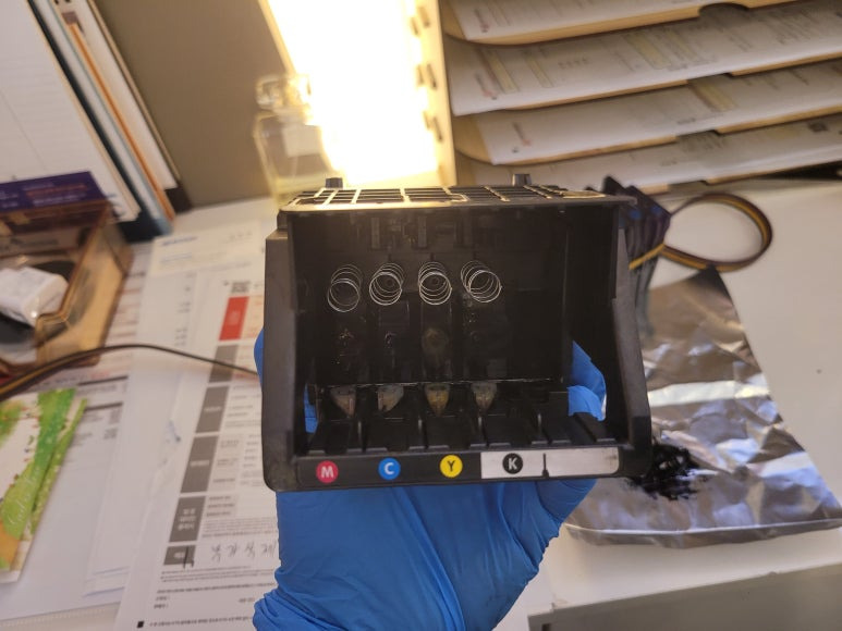 cf. 잦은 헤드 청소는 잉크손실, 내부오염, 헤드 노후화 및 칩판부 슈팅에어라인 비닐탈락, 챔버**터짐, 노즐 훼손, 헤드 챔버 내부 크랙 등 영향을 줍니다. 꾸준한 주기적인 4색 출력 관리가 필요합니다. 열분사 방식으로 잉크가 빠진 상태에서 사용시 헤드 노즐이 타서 망가질 수 있으니 사용자재 바랍니다