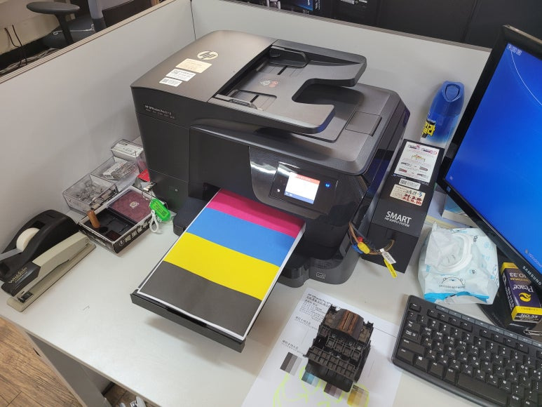 서울대학교 공과대학 31동 소재, 연구실에서 문서출력용으로 사용하는 HP 오피스젯 8710 팩스복합기 무한잉크인데 출력불가하여 출장수리 요청, 스케줄 잡아 이동 출장수리 완료했습니다.