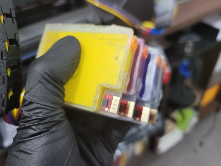 출력불량 및 잉크 카트리지 문제로 빠른 전체 점검 필요 이유 : 1. 호스 내 잉크 경화로 잉크공급 不 2. 카트리지 부싱 및 패킹 노후로 공기유입으로 잉크공급 不 3. 헤드 內 잉크공간 챔버 터짐 (칩판부 슈팅에어라인 비닐탈락, PCB 오염) 4. 스테이션 펌핑모터 불량으로 인한 잉크공급 不