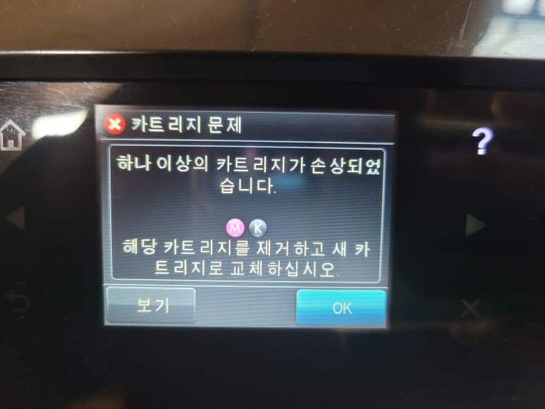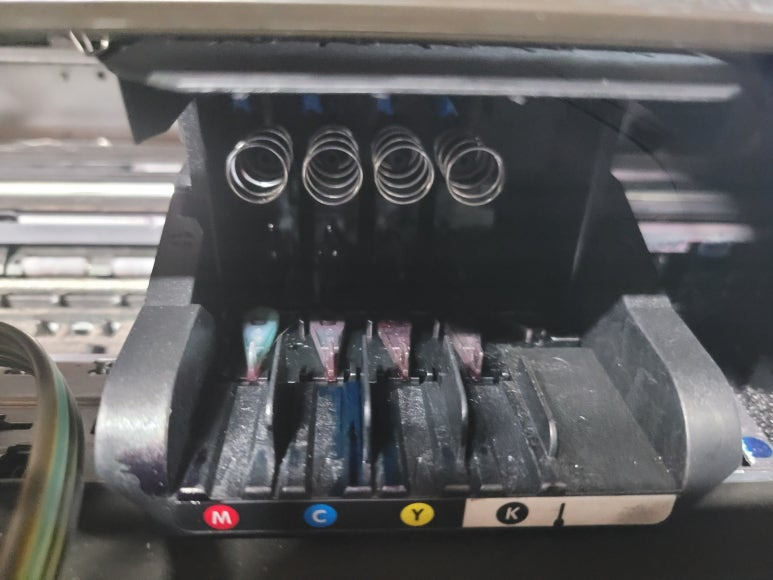출력불량 및 잉크 카트리지 문제로 빠른 전체 점검 필요 이유 : 1. 호스 내 잉크 경화로 잉크공급 不 2. 카트리지 부싱 및 패킹 노후로 공기유입으로 잉크공급 不 3. 헤드 內 잉크공간 챔버 터짐 (칩판부 슈팅에어라인 비닐탈락, PCB 오염) 4. 스테이션 펌핑모터 불량으로 인한 잉크공급 不