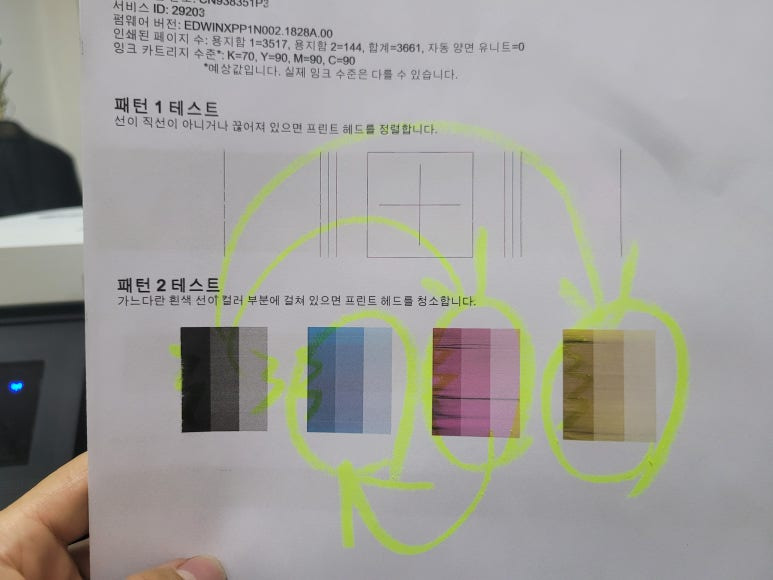 2) 매일 체크하지 않으면 노즐이 미세하게 막히면 헤드 청소를 해야 하는데 헤드청소시 이때, 잉크가 정말 많이 사용됩니다. 잉크 낭비까지 생각한다면 평소 출력해 체킹하는 게 좋습니다.(고지혈/동맥경화시 의료비가 듭니다)