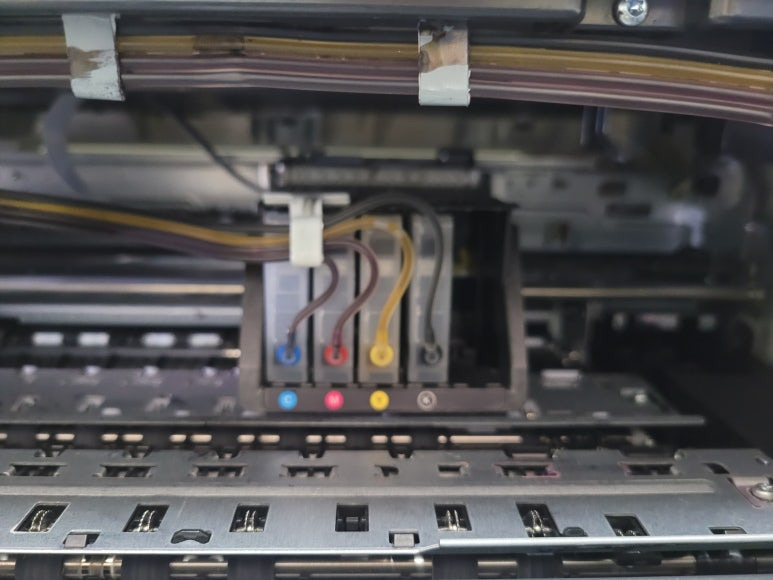 ● 프린터 헤드 클램프 부착 및 핫멜트 보강, 호스 재정리 장착