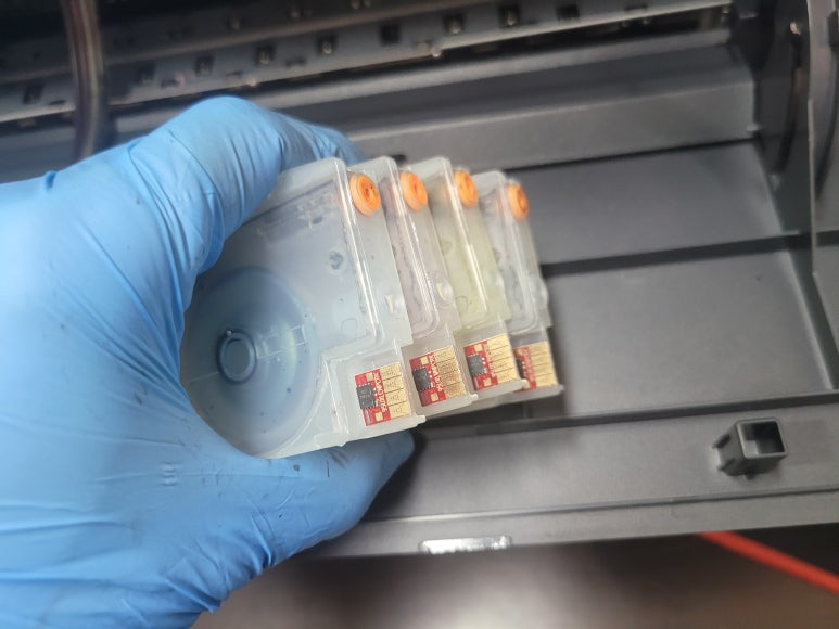 출력불량 및 잉크 카트리지 문제로 빠른 전체 점검 필요 이유 : 1. 호스 내 잉크 경화로 잉크공급 不 2. 카트리지 부싱 및 패킹 노후로 공기유입으로 잉크공급 不 3. 헤드 內 잉크공간 챔버 터짐 (칩판부 슈팅에어라인 비닐탈락, PCB 오염) 4. 스테이션 펌핑모터 불량으로 인한 잉크공급 不