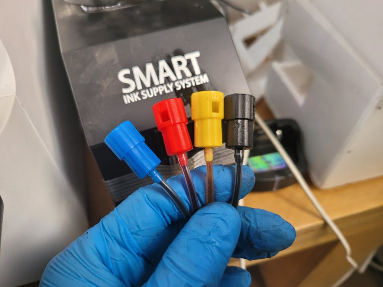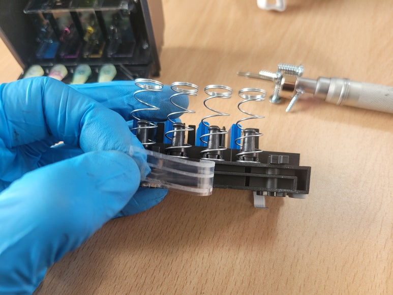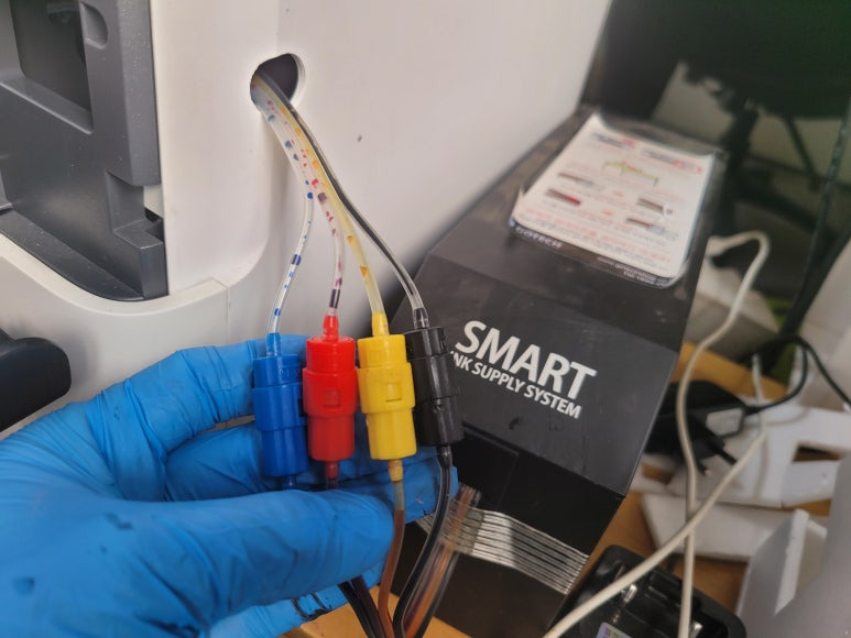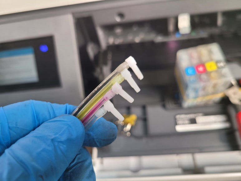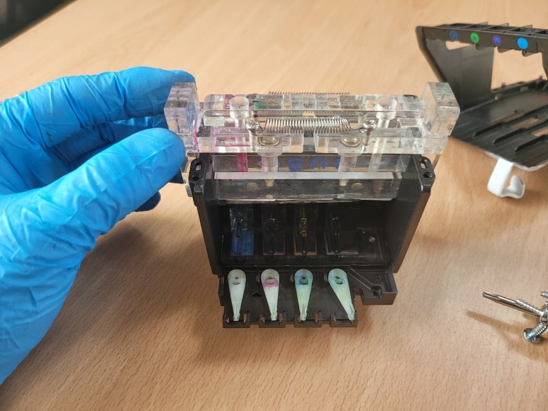 ● 프린터 헤드 클램프 부착 및 핫멜트 보강, 호스 재정리 장착