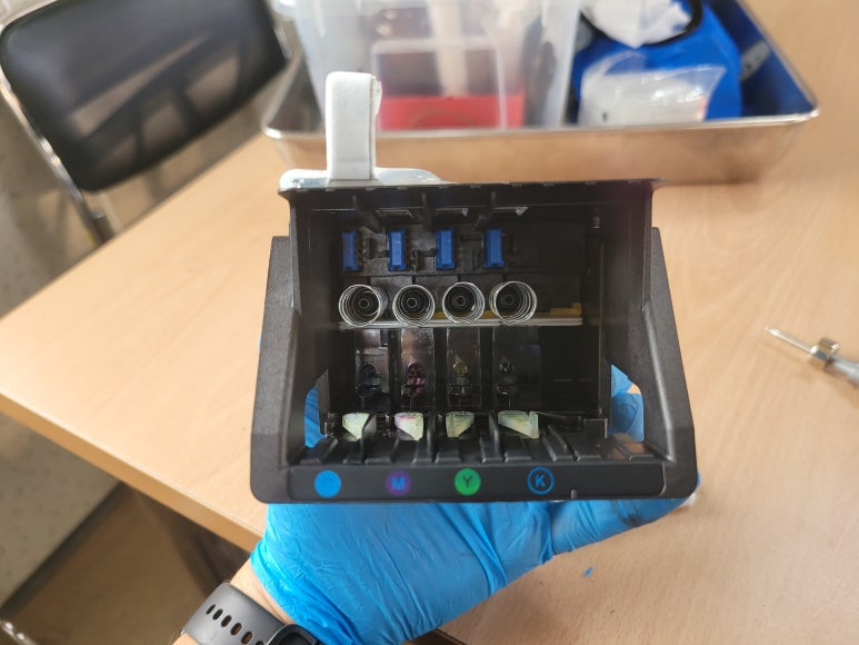 3) 미세한 노즐 막힘은 헤드 챔버 부분을 터지게 합니다. 사람도 뇌혈관이 막히면 터져 사망에 이르게 됩니다. 헤드도 노즐이 막히면 헤드가 터져 잉크가 흐르고 교체해야 하는 비용을 지불하거나 폐기해야 합니다. (중환자수술 또는 뇌출혈사망)