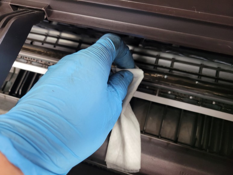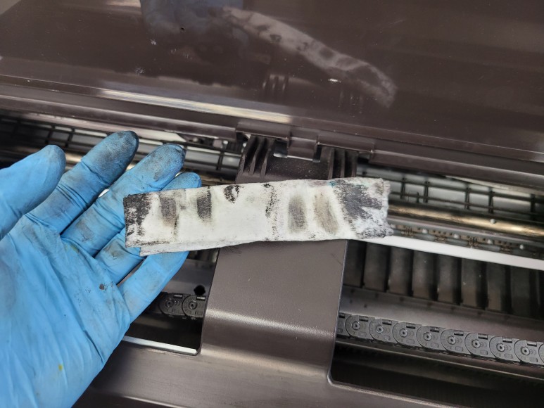 많은 출력량으로 심하게 오염된 엔코더스트립을 크리닝 했습니다.