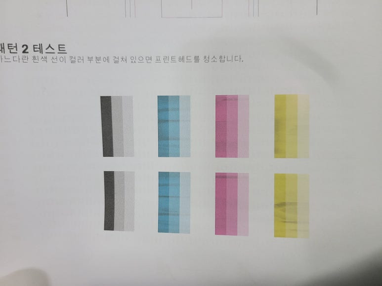 ⚠ 이상 시에만, 액정에서 설정 ➡ 유지 및 보수 ➡ 헤드청소 3단계 1회만 진행 (개선없다면 수리요청)